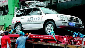中國移動的衛(wèi)星移動式基地臺車今天上午運抵高雄港。來源:臺灣《聯合晚報》