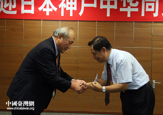 8月25日晚,日本神戶中華同文學校修學旅行團通過全國臺聯(lián)向臺灣南部災區(qū)捐款約5萬元人民幣。圖為全國人大常委、全國臺聯(lián)會長梁國揚(右)從修學旅行團帶隊老師手中接過捐款,并表示感謝。(中國臺灣網(wǎng) 鐘寶華 攝)