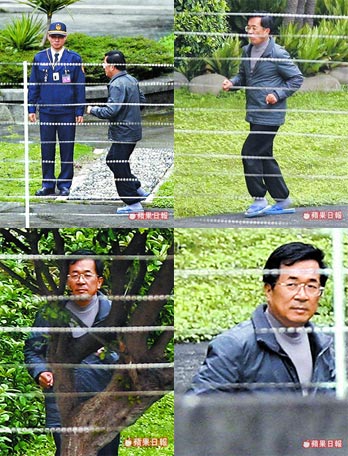 陳水扁進(jìn)入花圃后,先深深地吸了一口清新自由空氣,簡(jiǎn)單熱身后,就繞著花圃圓形水泥地,逆時(shí)針慢跑起來(lái)。為了避免發(fā)生意外,三名管理人員眼睛沒離開過(guò)他,不敢有絲毫放松,其中一人還全程拿著DV錄像。