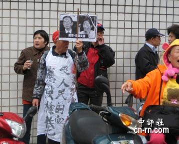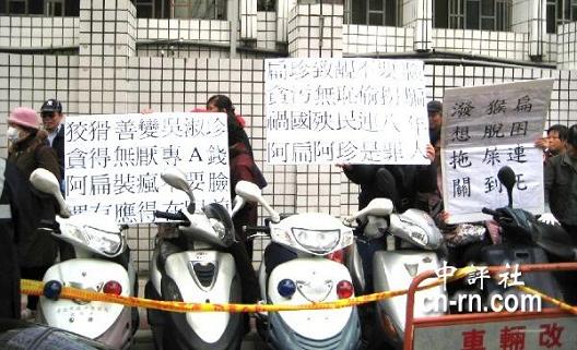據(jù)中評社報(bào)道,臺北地方法院今天起一連三天開庭審理扁家弊案,被告吳淑珍下午坐著輪椅出庭。法院外嗆扁群眾雖然只有10余人,但都有備而來,有人穿豬頭裝、有人自制白色圍兜、拿扁珍照片,還有人高舉大字報(bào)嗆扁珍,十分投入。