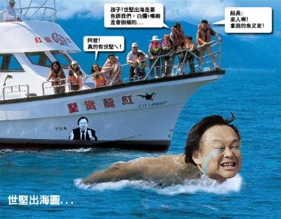 此外,連海報(bào)上的對(duì)話都成了網(wǎng)友展現(xiàn)KUSO(惡搞)的地方,上面寫著:“阿爸真的有世堅(jiān)!”“孩子!世堅(jiān)出海是要告訴我們,白爛加嘴炮是會(huì)倒霉的!保ㄖ芟龋