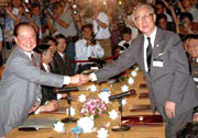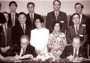 "海峽交流基金會(huì)"("海基會(huì)")于1990年11月21日成立,1991年3月9日舉行開幕式,正式掛牌運(yùn)行。該會(huì)分設(shè)由43人組成的董事會(huì)和由6人組成的監(jiān)事會(huì);"總統(tǒng)府資政"孫運(yùn)璇為名譽(yù)董事長;國民黨中常委、臺灣工商協(xié)進(jìn)會(huì)會(huì)長辜振甫任董事長;國民黨中常委、臺灣工業(yè)總會(huì)理事長許勝發(fā)和臺灣紅十字會(huì)秘書長,"國防部"法律顧問陳長文為副董事長兼秘書長,該會(huì)內(nèi)設(shè)秘書處,文化服務(wù)處、經(jīng)貿(mào)服務(wù)處、旅行服務(wù)處及綜合服務(wù)處等6個(gè)業(yè)務(wù)單位,主要功能是接受"陸委會(huì)"委托,辦理兩岸交流所衍生的各項(xiàng)事務(wù)。 |
