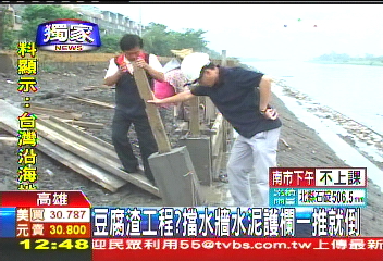 中國臺灣網(wǎng)10月22日消息 據(jù)臺灣TVBS電視臺報道,臺風(fēng)“鲇魚”使得在919水災(zāi)中受淹最嚴(yán)重的高雄市民再次神經(jīng)繃緊。今日下午,高雄市楠梓地區(qū)里長向高雄市政府提出抗議,他表示高雄市后勁溪擋水墻工程是“豆腐渣工程”,用2根手指就可以推到,若臺風(fēng)“鲇魚”來襲,后果不堪設(shè)想。