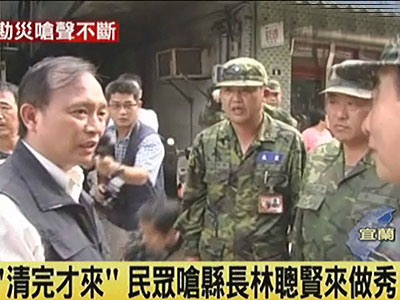 據(jù)報(bào)道,24日,天氣短暫放晴,民進(jìn)黨籍宜蘭縣長(zhǎng)林聰賢開(kāi)始巡視淹水災(zāi)區(qū),卻出現(xiàn)不尋常的現(xiàn)象,幾乎走到哪就被罵到哪。一名大叔說(shuō),都淹了好幾天了,還是靠著臺(tái)北的女兒上網(wǎng)把淹水的情況公布了大家才知道,而縣長(zhǎng)這個(gè)時(shí)候才到。也有老婦人說(shuō),淹水的時(shí)候看不到縣政府的人員前來(lái),還不是靠著自己的力量清理家園,都快清得差不多了,縣長(zhǎng)才出現(xiàn)。