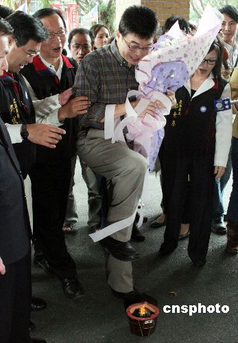 邱毅從坐牢地點高雄到臺北后,返回“立法院”,同黨“立委”依習俗,安排跨火爐儀式,去霉氣。
