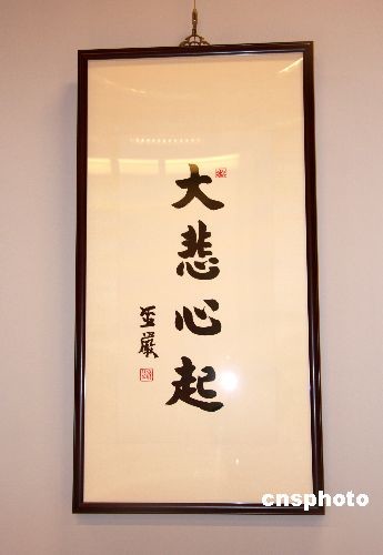 臺灣法鼓山創(chuàng)辦人圣嚴法師三日圓寂,四日移靈金山法鼓山世界佛教教育園區(qū)大殿供信眾瞻仰,圖為法鼓山現(xiàn)正展出的圣嚴法師墨寶“大悲心起”。 中新社發(fā) 陳立宇 攝