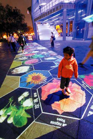 花博四展區(qū),連接美術(shù)、圓山兩區(qū)陸橋下廣場的互動光雕包括“花語寄情”、“蓮池魚蹤”等和民眾互動的花卉,讓民眾流連往返。圖片來源:臺灣《聯(lián)合報》