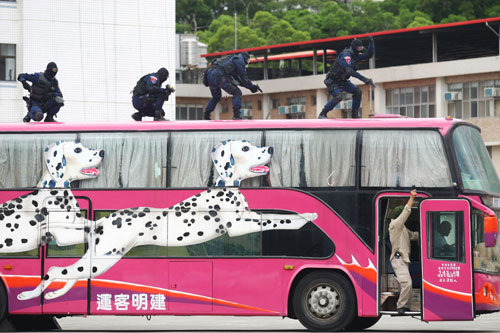 臺(tái)北花博反恐維安演訓(xùn)15日舉行,維安特勤隊(duì)與臺(tái)北市警局人員模擬公車(chē)遭挾持后,進(jìn)行談判、狙擊、攻堅(jiān)與人質(zhì)搶救。圖片來(lái)源:“中央社”