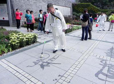 臺北花博會,陜西西安6位民眾組成“輕描淡寫”書寫團(tuán),正在西安展園用地書筆蘸清水,在地面進(jìn)行書法書寫,除了低碳又環(huán)保,還能鍛煉身體。圖片來源:“中央社”