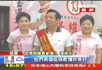 苗栗縣議員參選人湯維岳自嘲說:“至少我比別人多一雙腿(拜票),她們兩個(gè)姐妹感情非常好,向來和樂融融!睖S岳口中的“姐妹”,指的是就大、小老婆,一夫二妻共處30年,還一同出來拜票,甚至強(qiáng)調(diào)一人當(dāng)選,三人服務(wù)。