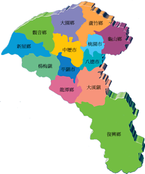 桃園縣位于臺灣西北部,緊靠臺北都會區(qū),大部分是連綿不斷的丘陵臺地,地形呈西北向東南的狹長形,臨山面海,自石門水庫起經(jīng)大溪鎮(zhèn)東北出縣境的大漢溪,將該縣劃分為東南和西北兩大部分。東南部分為海拔三百公尺以上的丘陵地、階地及山岳,地勢向東南漸次升高,山勢峻峭,河谷窄狹。西北部地勢則較為平緩,臺地、階地甚為發(fā)達(dá),河流短而呈放射狀入海。