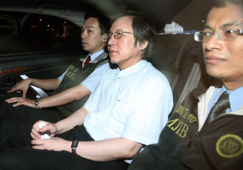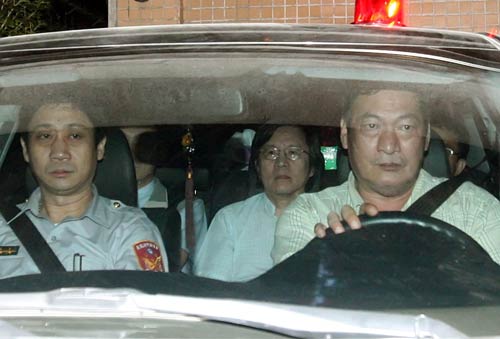 臺灣特偵組30日晚間傳喚臺當(dāng)局前“國安會秘書長”邱義仁(中)及5名證人到案。檢察官偵訊后認(rèn)為邱義仁涉嫌利用職務(wù)詐取財物罪嫌,于31日凌晨將邱義仁移送法院聲請羈押禁見。臺北法院審理后裁準(zhǔn),邱義仁坐進囚車,被送往臺北看守所!爸醒肷纭眻D