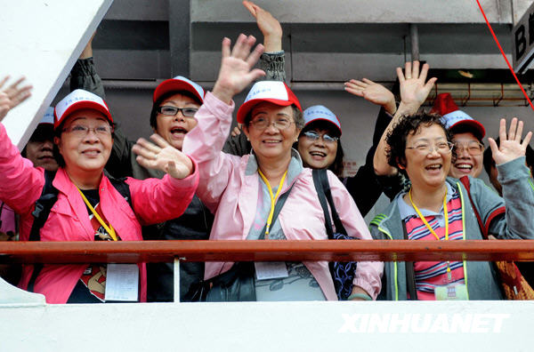 11月8日,抵達福州馬尾港的臺灣游客向前來迎接的福州鄉(xiāng)親招手致意。 新華社記者 張國俊 攝