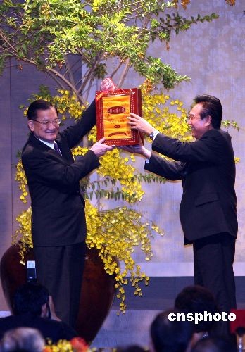 陳云林[右]致辭后向連戰(zhàn)贈送茅臺酒等禮物。