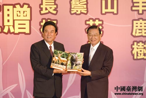 陳云林江丙坤舉行互贈(zèng)儀式,陳云林向江丙坤贈(zèng)送“團(tuán)團(tuán)”、“圓圓”圖譜,江丙坤向陳云林贈(zèng)送長鬃山羊和梅花鹿圖譜。(本網(wǎng)特派記者田云鵬 發(fā)自臺北)
