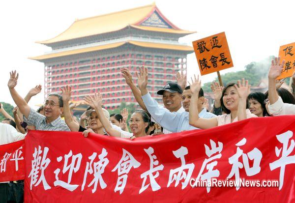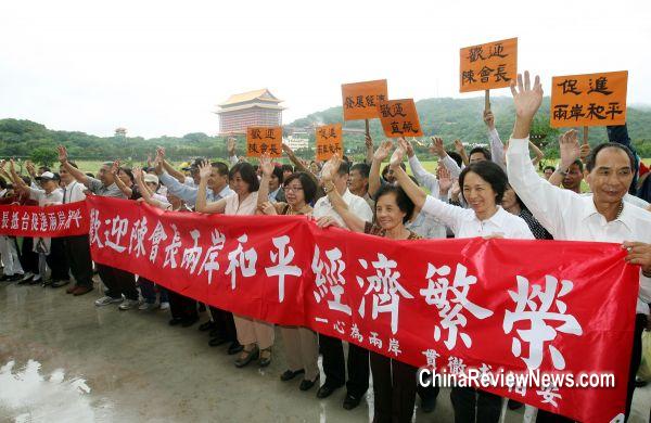大陸海協(xié)會會長陳云林到臺,臺灣的民間團體“中華兩岸事務(wù)交流協(xié)會”發(fā)動支持者到陳云林下榻的圓山飯店下方河濱公園,舉布條歡迎。圖片來源:臺灣“中央社” |
