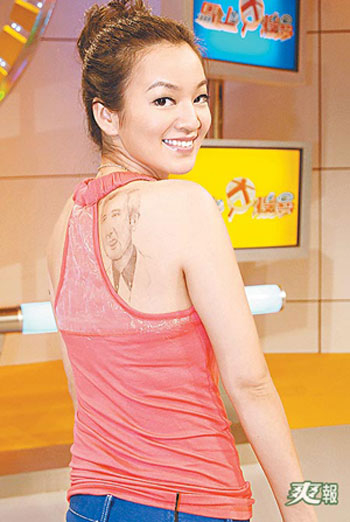 不過,右肩有圖、左肩卻顯得空空的,這時,另一個主持人Ruby突發(fā)奇想說:“右邊有‘馬總統(tǒng)’,左邊再畫個馬夫人,來個軟骨功,把左右臉邊的肩胛骨合起來,就可以讓‘馬總統(tǒng)’與馬夫人玩親親了!