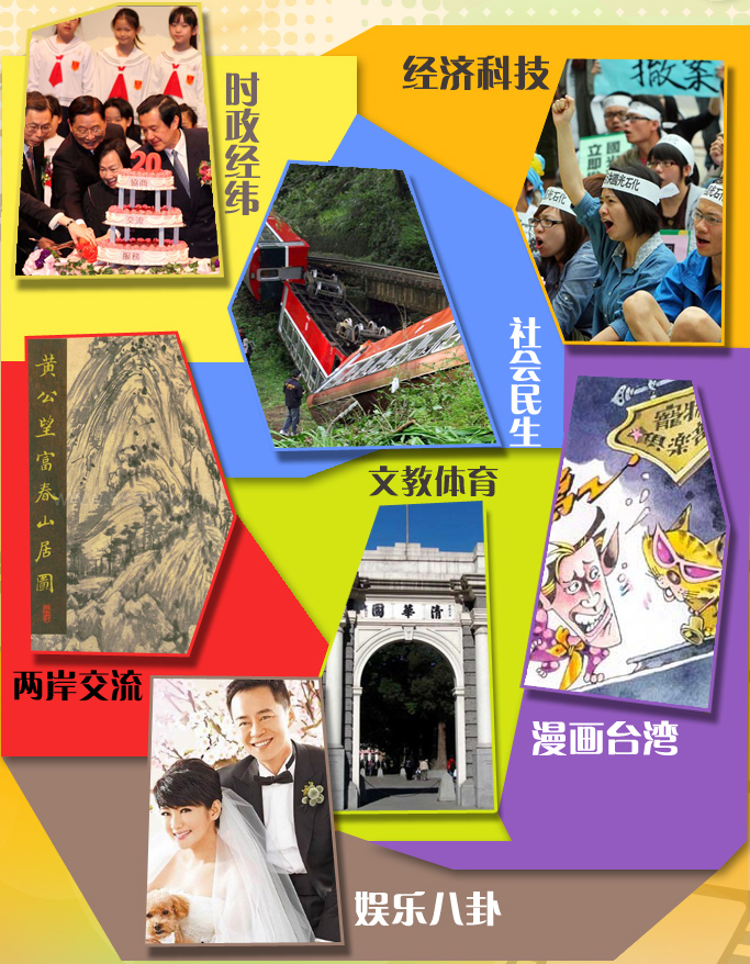 時(shí)政經(jīng)緯 經(jīng)濟(jì)科技 社會(huì)民生 兩岸交流 文教體育 漫畫臺(tái)灣 八卦娛樂
