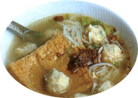 由宜蘭市沿著7號省道南行,經(jīng)過員山附近時(shí),路旁可見“員山魚丸”的招牌,幾家小吃攤雖規(guī)模不大,但熱氣騰騰的鍋爐旁,總圍坐著許多客人,其中不乏自外地遠(yuǎn)道而來。 員山魚丸呈米灰色,看起來雖不甚起眼,卻是真材實(shí)料,其魚漿采用雙髻鯊、旗魚等高級魚料制成,魚漿拌上精肉,再摻入芹菜、紅蔥頭與三星鄉(xiāng)的蔥、韭當(dāng)配料,均勻攪拌,魚丸有無彈性,就得看這攪拌的時(shí)間與手勁的拿捏功夫了。由于地近南方澳漁港,魚料十分新鮮、便宜,才造就出員山魚丸的物美價(jià)廉。 魚丸可口,魚丸湯也別樹一格,煮魚丸的清湯加上豬大骨熬燉,清鮮爽口而不膩,再加上魚漿本身就略具咸度,因此完全不需鹽和味精調(diào)味,風(fēng)味自然獨(dú)特。香味四溢的湯頭,加上香噴噴的粗米粉和油豆腐,這樣的員山魚丸米粉,吃法的確很不一樣。 客人如覺意猶未盡,現(xiàn)場還可提供魚丸、米粉外賣。其中員山路一段269號是創(chuàng)始于1963年的老店,其老板據(jù)傳為員山魚丸創(chuàng)始人阿涂伯的嫡傳弟子,手藝不凡,最是知名。