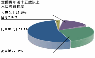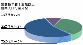 宜蘭縣人口數(shù)近47萬(wàn)人,滿(mǎn)十五歲以上人口約37萬(wàn)人,其中教育程度狀況,大專(zhuān)以上15.89%、高中職27.68%、初中職以下54.4%、自修2.02%;至于就業(yè)人口行業(yè)分配狀況為初級(jí)行業(yè)9.2%、次級(jí)行業(yè)36.2%、三級(jí)行業(yè)54.6%,和全臺(tái)的平均值初級(jí)行業(yè)7.8%、次級(jí)行業(yè)37.2%、三級(jí)行業(yè)55.0%,相當(dāng)接近。