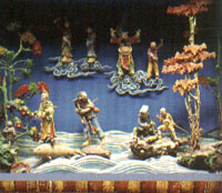 嘉義是臺灣交趾陶的發(fā)源地,因而有“交趾陶的故鄉(xiāng)”之稱,日人又稱之為“嘉義燒”。交趾陶為一種低溫多彩釉,是融合了軟陶與廣窯的一種陶藝,且包容了捏塑、繪畫、燒陶等技藝及宗教文化的民俗工藝,堪稱民間藝術的國寶。 據(jù)考證,交趾陶發(fā)源于兩廣福建一帶,清時隨移民傳入臺灣。臺灣的交趾陶主要作為廟宇或傳統(tǒng)建筑中的裝飾,多飾于廟宇建筑的屋頂、墻壁上的水車堵、身堵、墀頭,而題材多半以教化人心的忠孝節(jié)義及吉祥獻瑞等為主,其人物的身段、服飾則深受地方戲曲及歌仔戲的影響,不論人物或鳥獸、花卉的造型、用色,皆十分鮮艷生動而活潑,其特色在于晶亮艷麗的寶石釉彩,呈現(xiàn)多元豐富的民俗風格。 而在傳入臺灣的150年間,由于交趾陶的制作技巧難度高,因此習得此藝的匠師寥寥可數(shù),其中以尊為“葉王”的葉麟趾,為臺灣交趾陶的開山宗師。其作品還曾在世界博覽會中引起藝壇的震驚,被譽為臺灣絕技,后世尊為“臺灣交趾陶之父”,其作品散見于嘉南一帶各大廟宇,如今僅剩臺南學甲“慈濟宮”、佳里“震興宮”及嘉義“城隍廟”等地保留較完整;其作品造型豐富、沉逸古拙,尤以人物栩栩如生,用色沉斂穩(wěn)健,并獨創(chuàng)胭脂紅、翠綠顏色的釉料,后世更有“葉王交趾燒”之封譽。 同樣是寺廟裝飾要角的剪粘,主要飾于廟頂,常與交趾陶互為搭配。 近年來,本土意識覺醒,臺灣民俗傳統(tǒng)工藝日漸復興,交趾陶藝術再度受到重視,這項失落的民間工藝獲得重生。