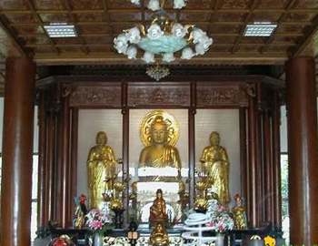 彌陀禪寺位于嘉義市的東南郊,前臨八掌溪,視野廣闊,晨鐘暮鼓、梵音繚繞,“彌陀鐘曉”同時(shí)也是嘉義八景之一。彌陀禪寺建于清干隆17年,光復(fù)后曾重建,外觀以金黃色為主。正殿供奉金身阿彌陀佛像,并以玄奘大師及開山袓師陪祀左右。
