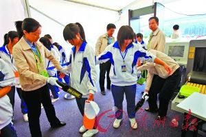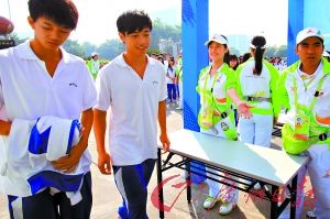 昨日上午9時(shí)40分左右,記者在東莞體育館門口看到了數(shù)百名學(xué)生排成的長(zhǎng)隊(duì)。據(jù)帶隊(duì)老師介紹,這些身著校服的學(xué)生是今早觀眾入場(chǎng)演練的“主角”——模擬觀眾。據(jù)介紹,這些模擬觀眾都是來(lái)自南城職業(yè)中學(xué)的學(xué)生!按蠹s有500人左右!蹦铣锹氈袔ш(duì)負(fù)責(zé)的楊老師告訴記者。