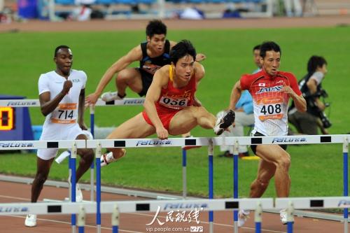 11月22日,在2010亞運(yùn)會(huì)田徑男子110米欄預(yù)賽中,劉翔13秒48小組第一進(jìn)決賽。(記者翁奇羽 攝影報(bào)道)