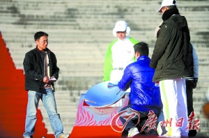 記者在中華世紀(jì)壇排練現(xiàn)場看到了廣州亞運游泳冠軍周嘉威和一名新疆殘疾少女