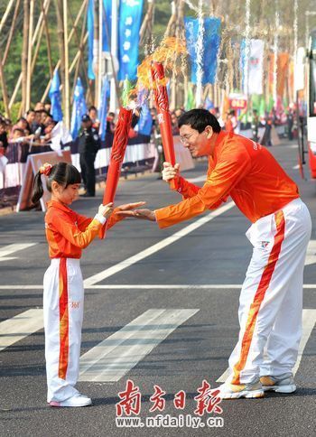 9時(shí)50分,張廣寧從火種護(hù)衛(wèi)隊(duì)員手中接過(guò)“潮流”火炬,從火種盆中點(diǎn)燃。第一棒火炬手符洪芝從張廣寧手中雙手接過(guò)火炬,廣州2010年亞洲殘疾人運(yùn)動(dòng)會(huì)廣州火炬?zhèn)鬟f起跑儀式開(kāi)始。