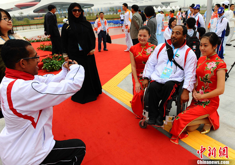 10日下午,廣州亞運(yùn)城升旗廣場上,參加亞殘運(yùn)會的一名選手邀請身著旗袍的禮儀小姐合影。中新社記者 柯小軍 攝