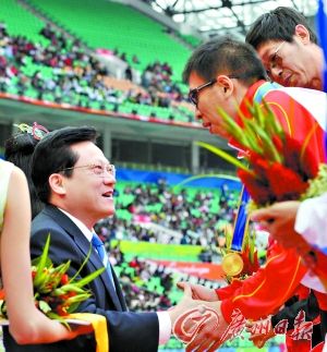 廣州亞殘運(yùn)會進(jìn)入第三天,各項(xiàng)比賽正在激烈進(jìn)行。昨日上午,省委常委、廣州市委書記、廣州亞運(yùn)會亞殘運(yùn)會賽會運(yùn)行總指揮部總指揮張廣寧來到廣東奧林匹克中心體育場,檢查亞殘運(yùn)會賽事運(yùn)行工作,觀看田徑比賽并為獲獎(jiǎng)運(yùn)動(dòng)員頒獎(jiǎng)。市領(lǐng)導(dǎo)許瑞生、陳國、平欣光參加活動(dòng)。