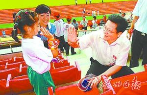 廣東省委常委、廣州市委書記張廣寧(右)在天河體育中心清潔亞運(yùn)場館,與小志愿者擊掌互相鼓勵。 吳楚斌 攝《人民日報(bào)》記者 羅艾樺 賀林平