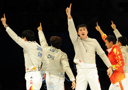 決勝后中國(guó)隊(duì)沖上擊劍臺(tái)慶祝