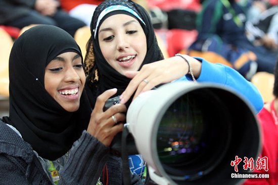 亞運會不只是運動員競技的舞臺,五湖四海的觀眾也匯集在這里,傳遞著友誼和歡樂。圖為兩位來自也門的美女對記者的“大炮”鏡頭產(chǎn)生了興趣。 中新社記者 張雷 攝