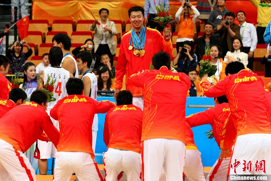 11月26日晚,2010亞運(yùn)會(huì)男籃決賽,中國隊(duì)77-71戰(zhàn)勝韓國奪冠。圖為中國隊(duì)隊(duì)員向王治郅鞠躬致意。中新社記者 富田 攝