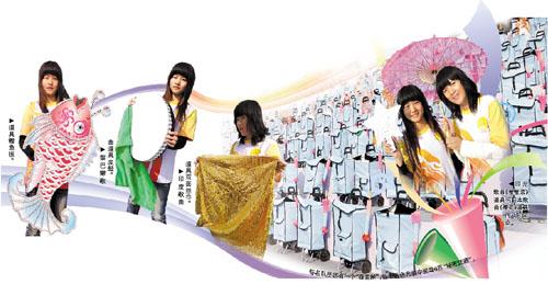 最值得一提的是,在海心沙舞臺上,每名合唱隊員都有一個道具“百寶箱”,這個藍色布袋中裝著6件“秘密武器”,需要配合不同歌曲來表演,營造舞臺氣氛。其中有《月光光》時的浪花板和魚板,《櫻花》時的粉紅小傘,印尼歌曲時的星星索,印度歌曲時的紗巾,黎巴嫩歌曲時的小鼓。
