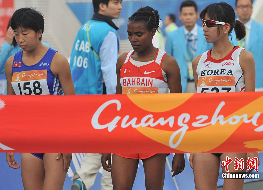 11月27日清晨,女子飛毛腿們聚集廣州亞運會最后一天的馬拉松賽場,朝鮮名將全京姬(左一)和韓國名將淋敬熙(右一)站在同一起跑線上準備一較高下。中新社記者 賈國榮 攝