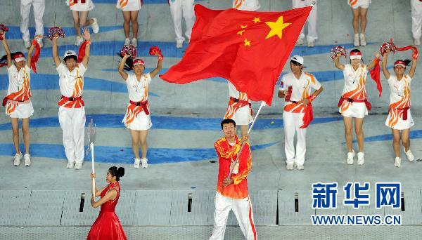 11月27日,中國(guó)男籃運(yùn)動(dòng)員王治郅在閉幕式上揮舞國(guó)旗入場(chǎng)。當(dāng)日,第16屆亞運(yùn)會(huì)閉幕式在廣州市海心沙島舉行。 新華社記者楊磊攝