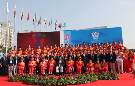 廣州亞運會勝利閉幕,運動員村并沒有“休息”,經(jīng)過4天緊鑼密鼓地轉(zhuǎn)場、準(zhǔn)備,迎來了廣州亞殘運會的客人。8日,廣州2010年亞洲殘疾人運動會運動員村開村暨中國體育代表團入村歡迎儀式,在亞運城運動員村升旗廣場隆重舉行。中國殘聯(lián)黨組書記、理事長,中國殘奧委員會主席、廣州亞殘運會組委會執(zhí)行主席王新憲;中國殘聯(lián)黨組副書記、常務(wù)副理事長,廣州亞殘運會組委會副主席王乃坤女士;中國殘聯(lián)黨組成員、副主席,中國殘奧委員會執(zhí)行主席、廣州亞殘運會組委會副主席、中國體育代表團團長呂世明;國家體育總局黨組成員、副局長、中國殘奧委會執(zhí)行主席、廣州亞殘運會組委會副主席、中國體育代表團團長馮建中;中國殘聯(lián)黨組成員、副理事長、體育部主任,中國殘奧委員會常務(wù)副主席,廣州亞殘運會組委會副秘書長、中國體育代表團執(zhí)行團長賈勇;亞殘奧委會秘書長馬利尼·拉賈薩加蘭女士;廣東省委常委、廣州市委書記、廣州亞殘運會組委會副主席兼秘書長張廣寧;廣東省副省長、廣州亞殘運會組委會副主席林木聲;廣州市委副書記、廣州市市長、廣州亞殘運會組委會副主席萬慶良;廣州市委常委、亞運城賽區(qū)領(lǐng)導(dǎo)小組組長、運動員村村長孔少瓊女士;廣州市委常委、秘書長陳如桂;廣州市副市長、廣州亞殘運會組委會常務(wù)副秘書長許瑞生、廣州市副市長、廣州亞殘運會組委會副秘書長陳國和廣州市政府秘書長謝曉丹等領(lǐng)導(dǎo)和嘉賓,以及200名中國體育代表團成員出席了儀式。