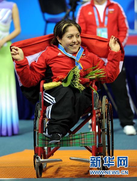 12月13日,敘利亞選手努拉·巴杜爾身披國旗在領(lǐng)獎臺上露出燦爛笑容。當日,敘利亞選手努拉·巴杜爾在廣州2010年亞殘運會女子A組40公斤級舉重比賽中,以82.5公斤的成績奪得銀牌。新華社記者范長國攝
