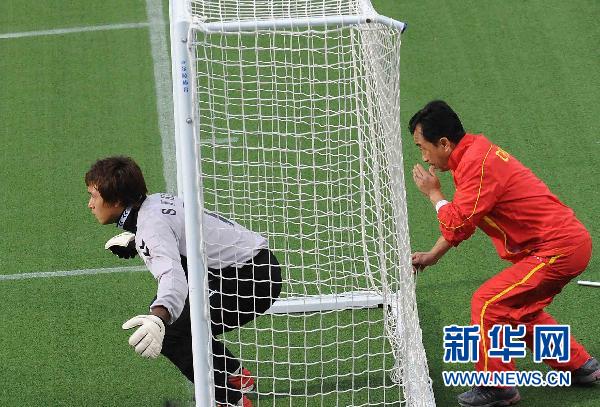 12月14日,中國(guó)五人制(盲人)足球隊(duì)教練鄒宏謀(右)在對(duì)手門后大聲喊叫,為隊(duì)員提示進(jìn)攻方向。提起足球教練,人們都會(huì)想到那是一個(gè)十分風(fēng)光的角色:要么穩(wěn)坐場(chǎng)邊,鎮(zhèn)定指揮;要么滿場(chǎng)吼叫,放縱個(gè)性。但是,在廣州亞殘運(yùn)會(huì)的五人制(盲人)足球比賽場(chǎng)內(nèi),你卻很難找到教練的身影。原來(lái),對(duì)陣雙方的教練都“躲在”了對(duì)手球門的后面。只見(jiàn)他們時(shí)而大喊,時(shí)而擊掌,左右跑動(dòng),十分忙活。據(jù)介紹,五人制(盲人)足球是根據(jù)盲人視障特點(diǎn)設(shè)計(jì)的一項(xiàng)集體球類項(xiàng)目。比賽中,教練站在對(duì)手球門的后面,通過(guò)發(fā)出各種聲響,幫助球員對(duì)來(lái)球的方向、速度以及進(jìn)攻、防守的位置進(jìn)行判斷,從而迅速做出反應(yīng)。有人曾形象地比喻:“五人制(盲人)足球的教練,就是球員在場(chǎng)上的一雙眼睛”。新華社記者王頌攝