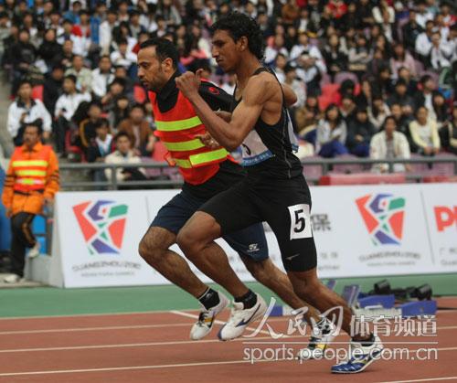 人民網(wǎng)廣州12月14日電(記者 劉龍攝影報道)12月14日,在廣州2010年亞殘運會田徑男子200米T11級比賽中,T11級比賽是有引導(dǎo)員領(lǐng)跑的比賽。