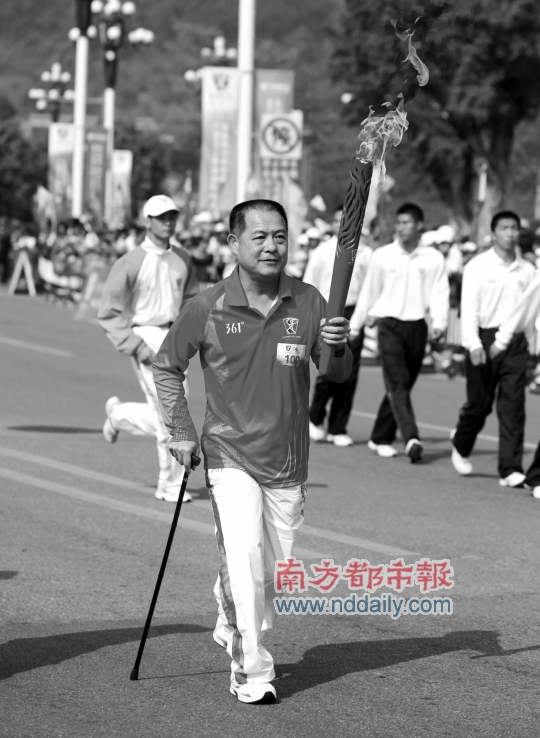 左手拿著火炬、右手拄著拐杖,孫俊明來到了100棒號(hào)牌的位置上。異常興奮的他在起跑前舉起火炬讓現(xiàn)場(chǎng)的群眾觸摸。