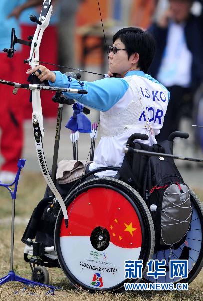 12月13日,韓國(guó)選手高希淑在比賽中。當(dāng)日,在廣州2010年亞殘運(yùn)會(huì)女子團(tuán)體反曲弓公開(kāi)級(jí)排名賽中,韓國(guó)隊(duì)以1811環(huán)的總成績(jī)打破世界紀(jì)錄。新華社記者陳曄華攝