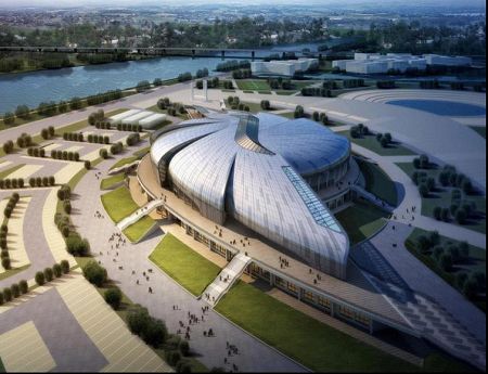 南沙體育館是亞運(yùn)會(huì)武術(shù)比賽場(chǎng)館,因此在設(shè)計(jì)上場(chǎng)館也體現(xiàn)了中國(guó)武術(shù)的意境。南沙體育館的外殼分九個(gè)曲面單元,單元間片片層疊,并分為南北兩組以比賽大廳圓心為中心呈螺旋放射狀展開。這種富有動(dòng)感的設(shè)計(jì)隱喻了中國(guó)武術(shù)的最高境界——“陰陽(yáng)俱合,天人合一”。同時(shí)結(jié)合廣東海洋文化的特征,借鑒了富有肌理變化的“海螺”外殼作為造型設(shè)計(jì)的意向。南沙體育館主體鋼結(jié)構(gòu)部分采用了雙層環(huán)形張弦穹頂結(jié)構(gòu),主跨度達(dá)到了98米。