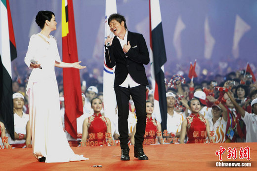 11月12日晚,廣州亞運會開幕。圖為毛阿敏、孫楠演唱亞運會歌《重逢》。中新社記者 杜洋 攝