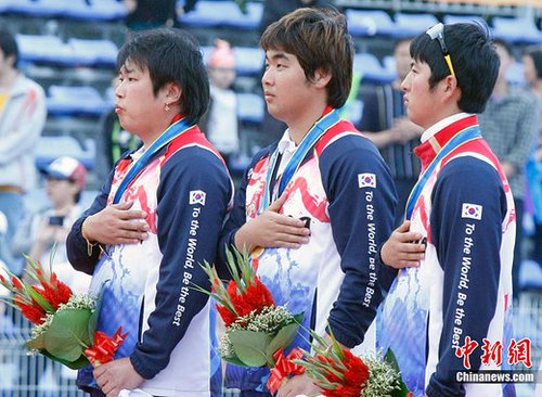 11月21日,在廣州奧體射箭場(chǎng)舉行的廣州亞運(yùn)會(huì)射箭項(xiàng)目男子團(tuán)體決賽中,韓國(guó)運(yùn)動(dòng)員林東賢、金優(yōu)鎮(zhèn)、吳真爀以222環(huán)的成績(jī)奪得冠軍。中國(guó)隊(duì)以218環(huán)位居第二,印度隊(duì)以220環(huán)奪得銅牌。中新社記者 張茵 攝