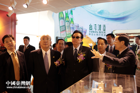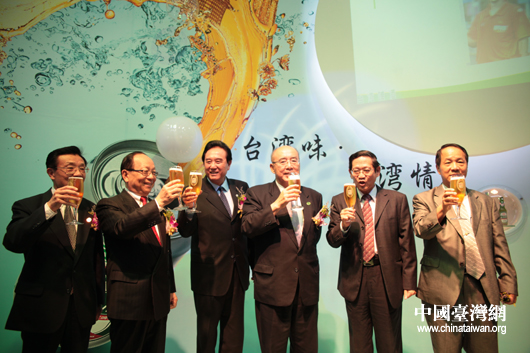 臺灣啤酒亞運展示中心11月12日上午正式開館,海峽兩岸關(guān)系協(xié)會會長陳云林、中國國民黨榮譽主席吳伯雄、副主席蔣孝嚴等在展館內(nèi)共同品嘗臺灣啤酒。(中國臺灣網(wǎng) 鐘寶華 攝)