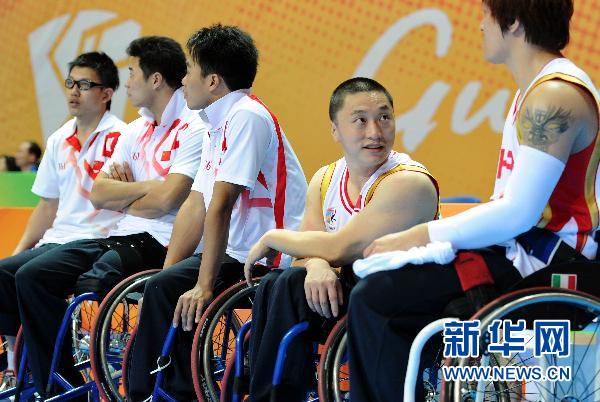 12月14日,在2010年亞殘運(yùn)會(huì)中國(guó)對(duì)陣阿聯(lián)酋的輪椅籃球賽場(chǎng)邊,陳海江(右二)與年輕球員交流。 34歲的陳海江是中國(guó)男子輪椅籃球隊(duì)最年長(zhǎng)的球員。13年前的一場(chǎng)可怕事故讓這位內(nèi)蒙古小伙腰部以下完全癱瘓,陳海江的人生陷入灰暗。是籃球重新燃起陳海江的希望,6年的輪椅籃球生涯讓陳海江的人生重新“站”了起來(lái)!新華社記者劉大偉攝